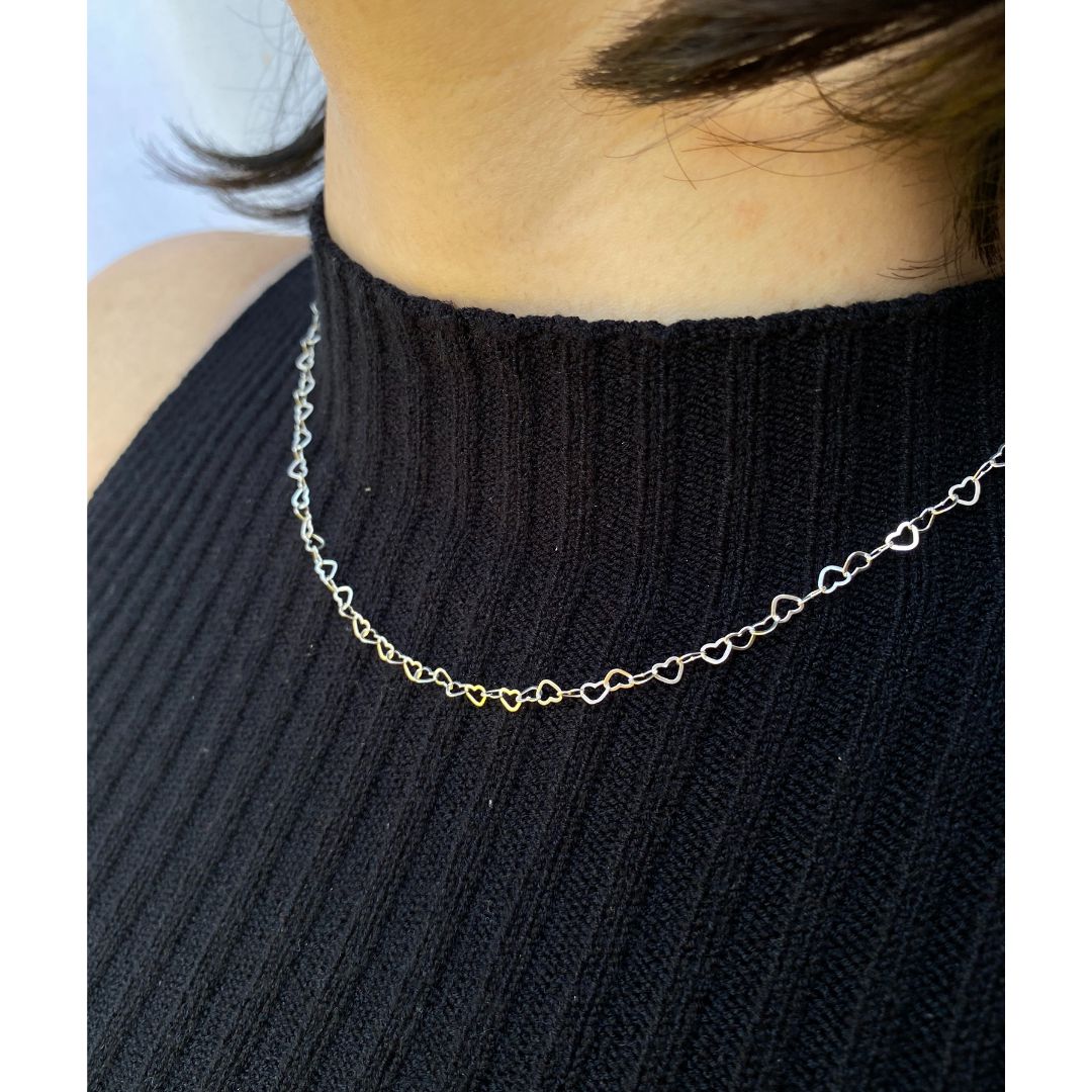 Corrente de corações vazados e acoplados uns aos outros, confeccionada na prata 925.